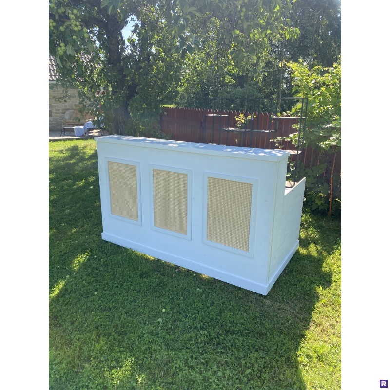 Valge, rotangist esipaneeliga baarilett on kiire lahendus baariala sisustamiseks või ka food station`i loomiseks.