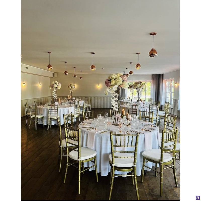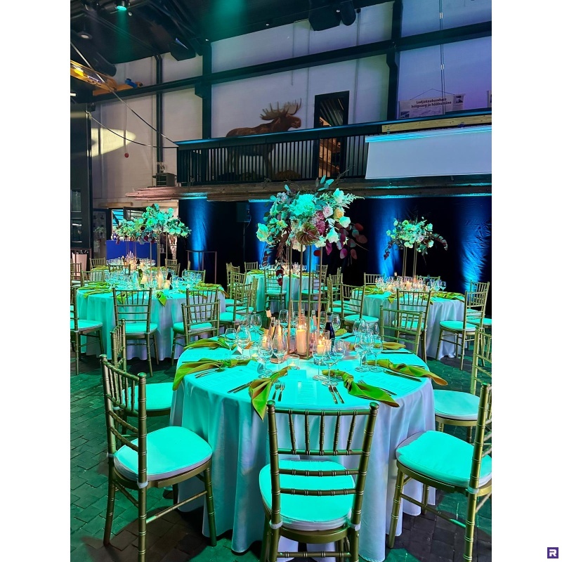 Kuldsed, puidust chiavari toolid sobivad erinevatele sündmustele. Vali juude ka kuldsed söögiriistad, kuldsed servjetid. Erinevaid laudu või erinevas värvitoonis laudlinu kasutades on tulemuseks täiesti omanäoline sündmus.